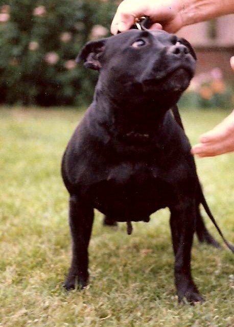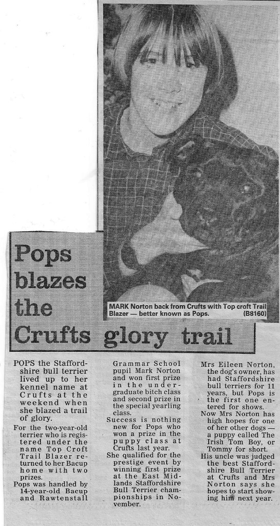 We also staggered over the line for Popsy’s Junior Warrant – on the last eligible day we had entered two Open shows, requiring just one point to get the JW, (back then, you could go to any number of shows every weekend, with Staffords scheduled at them all). We missed out at the first show, but made it at the second, the judge? None other than Arthur Johnson, who gave Popsy her first point! It was even at the same venue.