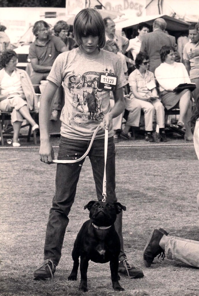 1985, what a phenomenally exciting year that was, Popsy achieving all the early promise, not quite as we thought it would be but how it usually is, with ups and downs, more of the latter. A lot is said about face judging and judges putting up safe options/friends/etc but this is a good example of how, in Staffords, total newcomers can make up a dog, in our case with a child handler. Simultaneously, the Cookes (Ronnie, Blanche and Julie) made up Ch Eccstaff Tuxedo Warrior, their first dog.