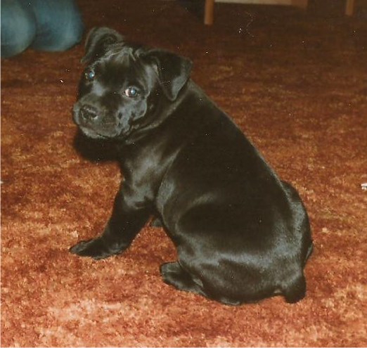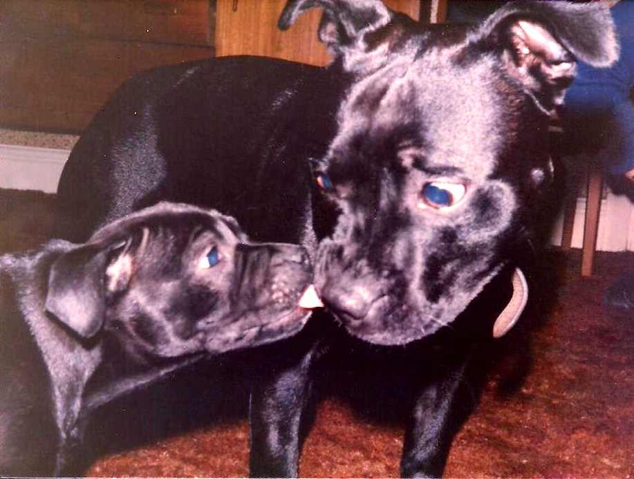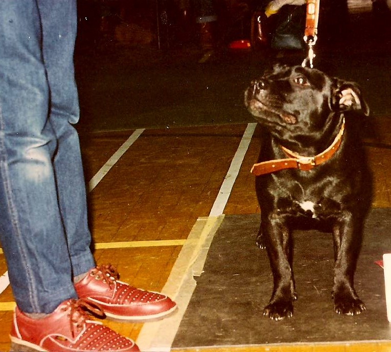 Elaine somehow managed to persuaded me to have a puppy off our pals Brian & Sandra Bailey’s bitch, Daisy, she even paid for it. This was in 1983, we already had a Stafford – Sally (Topcroft Majorette) but she wasn’t exactly typical, sleeping all day and sleeping all night, she only came to life when food was around.
