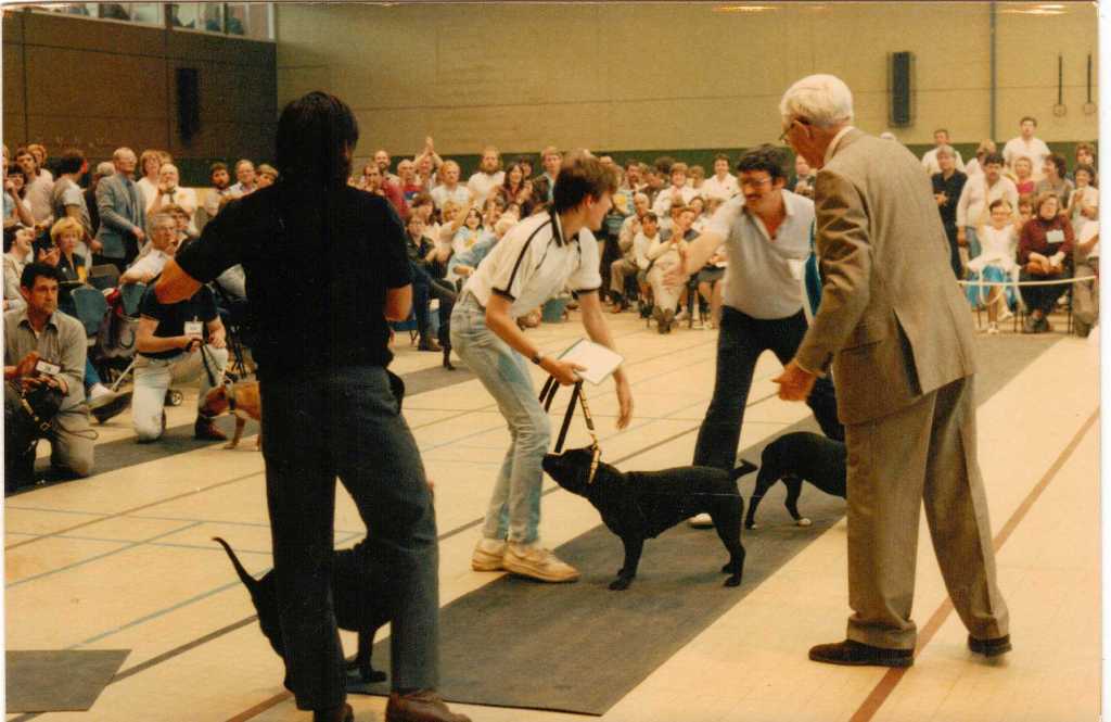 This event soon arrived; Brian & Sandra came along with the kids, so our party were 8 strong plus Popsy of course. Only one ring, bitches second on, the judge was one Arthur Johnson, a long time NW member. The Minor Puppy bitch class was called and was no sooner started than it was finished, with our Mark handling. The judge is looking around; he’s picking his winner – 1st Topcroft Trailblazer!!