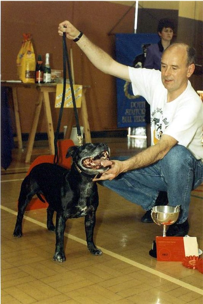 This picture is of Popsy at her first Champ show 2 months later (in a similar pose to the one above, looking up at Mark) – the Northern Counties SBT Club – held at Rotherham in December. Popsy won both the Minor Puppy and the Puppy classes under judge Norman Entwistle – his critique ended with “should hear more of her” – indeed.