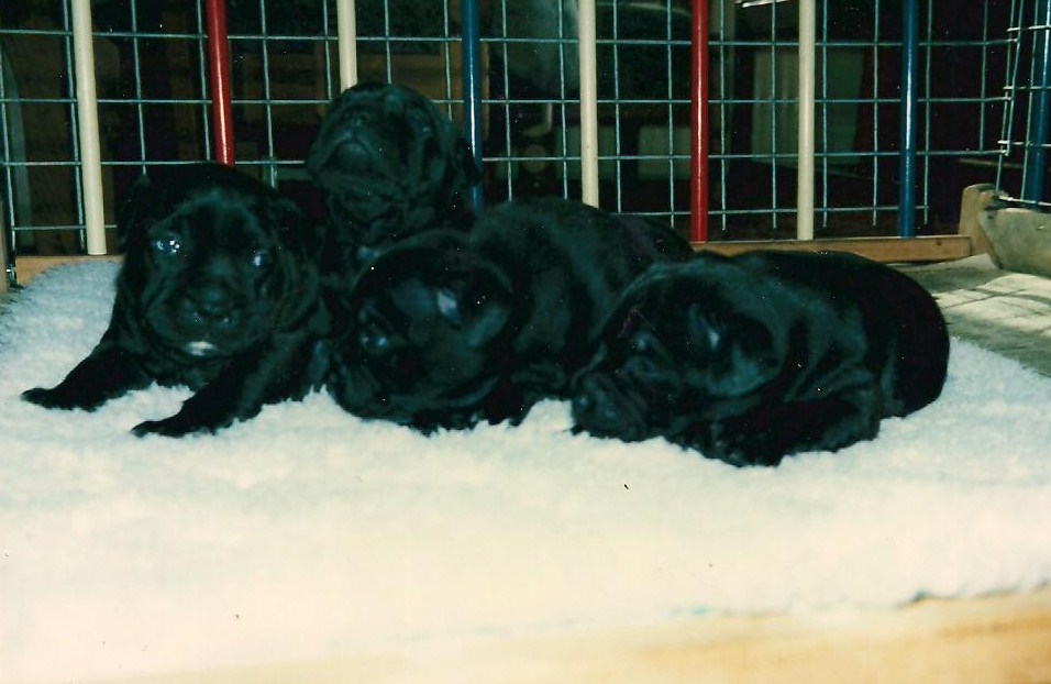 Time soon passed and before we knew it Popsy’s puppies were due anytime. But before that I’d made a whelping box using the guidelines in one of John F Gordon’s books – it resembled a small drawer!! I started again this time with contiboard. Elaine had been advised to procure a book on dog breeding – Hilary Harmar’s – Dogs And How To Breed Them. So when Popsy started, there we are, book open at the right place – watching Popsy with opened book in hand; putting me in mind of my car maintenance days – wasn’t any good at that either. After much thrutching and pushing, a bag appeared full of green liquid and that was it. Elaine called Carole (Atherton) – at least she’s had a couple of litters – get to the vets – caesarean here we come. Later, the vet presented us with two (dog) puppies via the reception area accessed by a gate, about 3 foot high. He told us that one of the pups, the brindle one (the other was black) had just fallen out of Popsy, no bag, no after birth – and still survived.